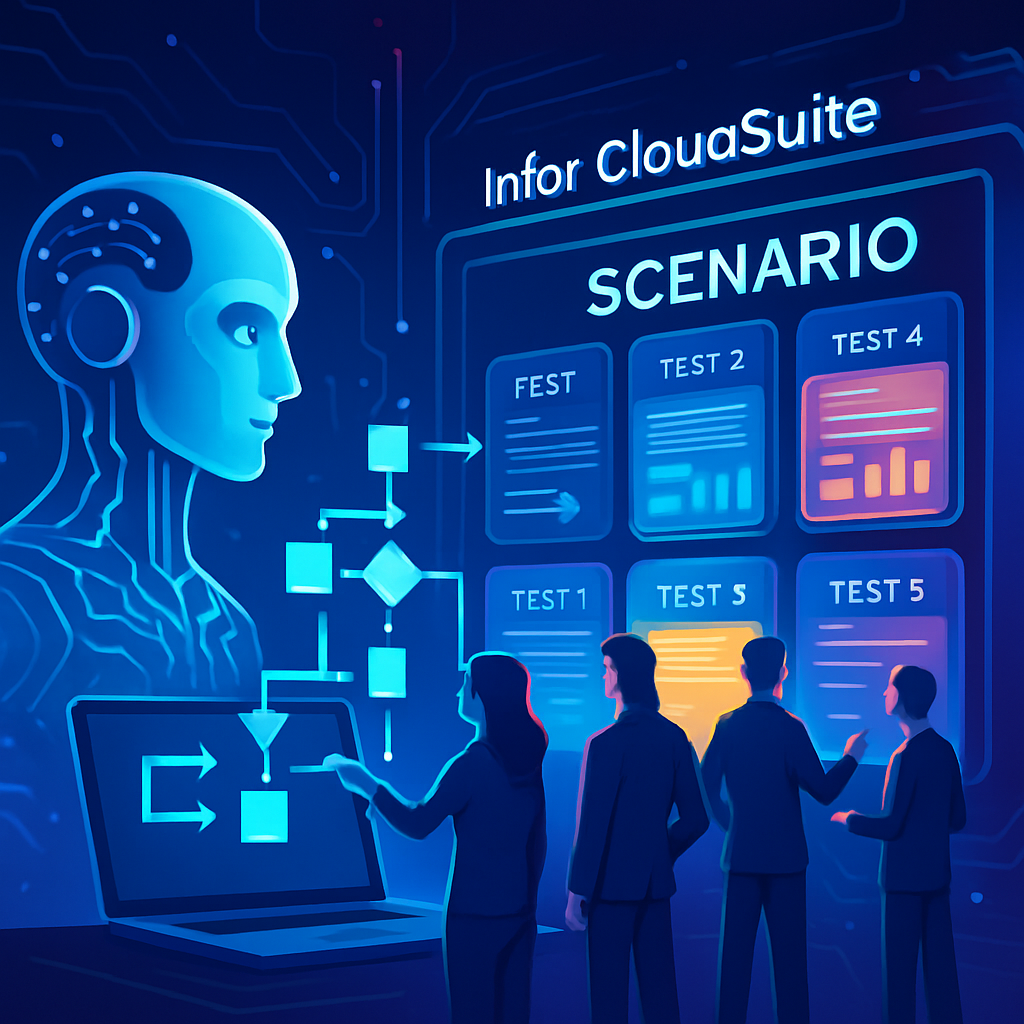 One of the biggest challenges in ERP testing is scenario design. Business teams know their processes, but translating those into structured test scenarios with input data, validations, and edge cases takes time and expertise. With large Infor rollouts, the number of scenarios quickly grows into the hundreds, if not thousands.